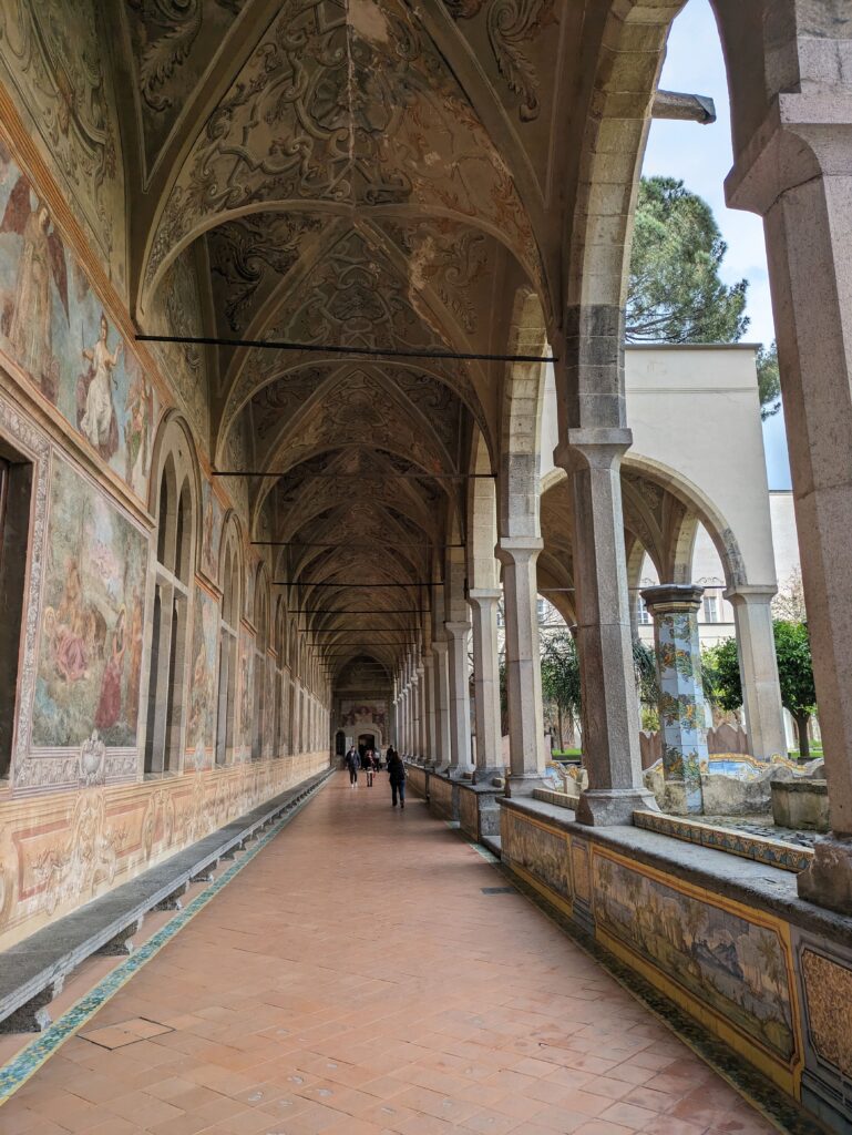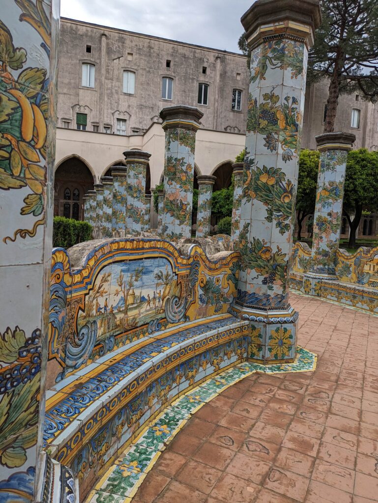 Je mag trouwens niet op de zuilen gaan zitten, want je ziet al wat schade van de toeristen die dat wel hebben gedaan. Dit klooster is één van de bekendere trekpleisters dus je bent er niet alleen. Tegelijk is het ook wel een rustpunt, weg van de drukke spaccanapoli straat.