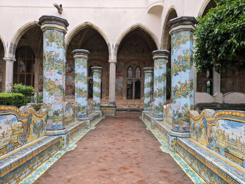 Op het pleintje voor de kerk vind je de obelisk van de Onbevlekte Maagd en ook de ingang naar het Complesso Monumentale de Santa Chiara. Voor 7 euro per persoon mag je het klooster, de kerk en het museum bezoeken. In Vomero waren we al eerder verliefd geworden op zo’n klooster dus we haalden snel die portefeuille boven.
