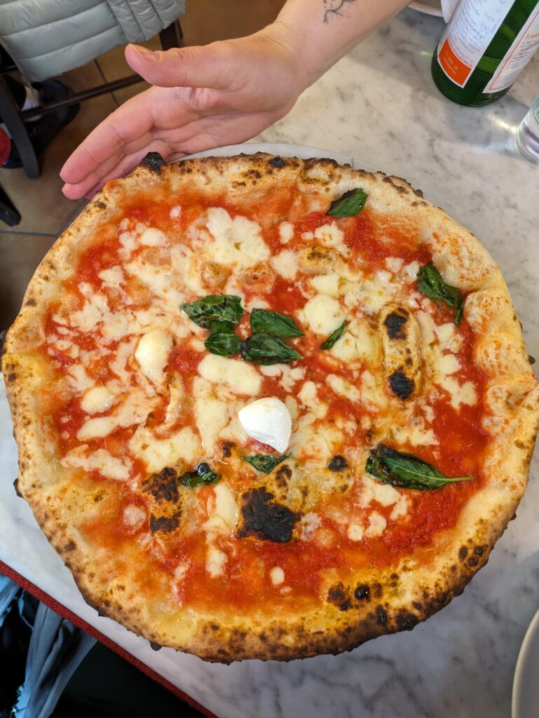 Nu begon het te regenen en dus doken we Pizzeria I Decumandi binnen. Eten in het toeristisch centrum is altijd wat moeilijker, maar deze stond in de reisgids. Zeer grote en goedkope Napolitaanse pizza in een typisch Italiaanse zaak. Was het de beste pizza van de vakantie? Neen, maar er was ook helemaal niets mis mee.